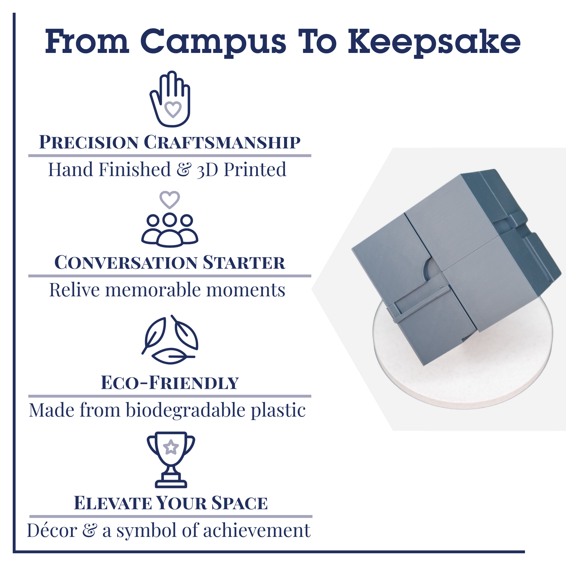 Transform your space with our handmade 3D printed replica of Endover aka The Cube, located on The University of Michigan's campus in Ann Arbor, Michigan. Perfect for students or alumni, this piece adds a touch of nostalgia to any setting—whether it's your home office desk, bookshelf, or dorm room. It even makes a great cake topper or graduation party favor.
