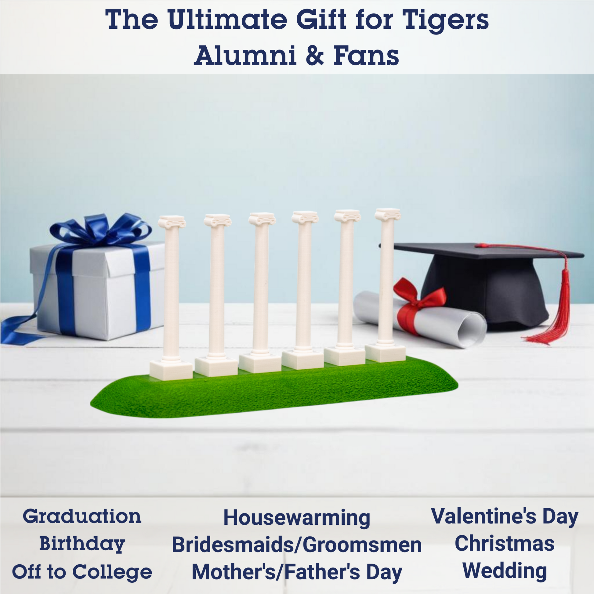 Transform your space with our handmade 3D printed replica of The Columns, located on the University campus in Columbia, Missouri. Perfect for any Tigers student or alumni, this piece adds a touch of the Columbia campus nostalgia to any setting—whether it's your home office desk, bookshelf, or dorm room. It even makes a great cake topper or graduation party favor for Mizzou graduates 🎓